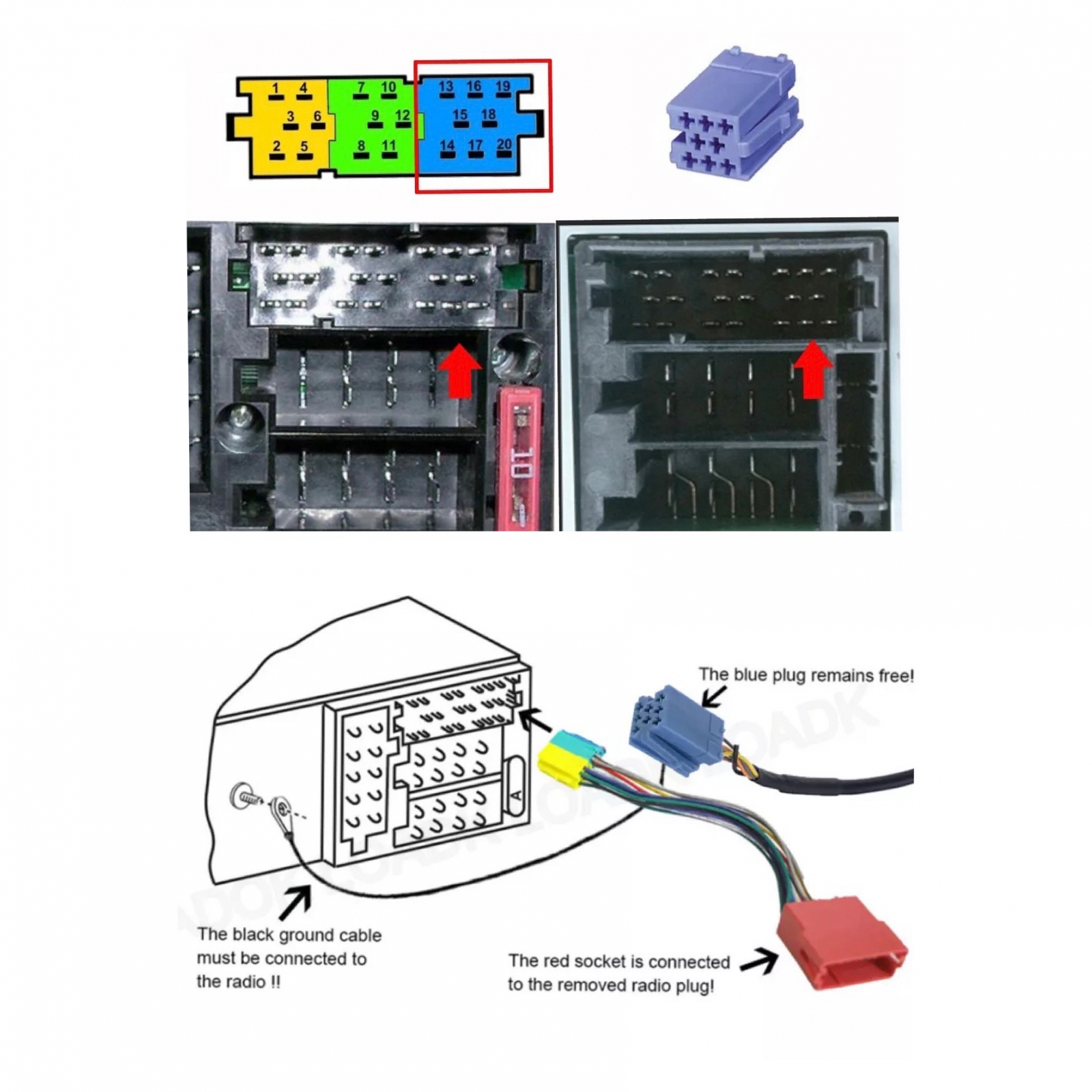 Adaptorul se conecteaza in spatele unitatii audio in priza destinata magaziei de CD-uri. Doar mufati si fixati cablul pentru masa pe carcasa unitatii audio.
