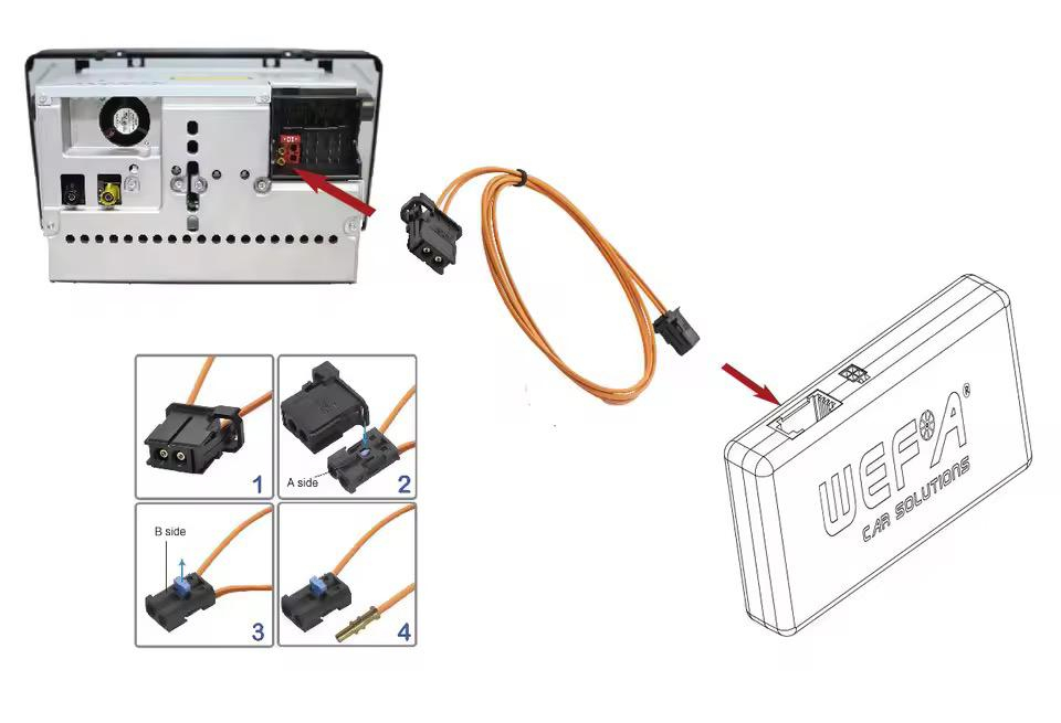 Instalarea interefetie se face in spatele unitatii audio prin conectarea fibrei optice la fibra masinii conform schitei din imagine. Alimentarea se va realiza conectand cavlurile rosu si negru la +12 V si – 12 V. Se recomanda ca instalarea sa se realizeze de personal special autorizat.